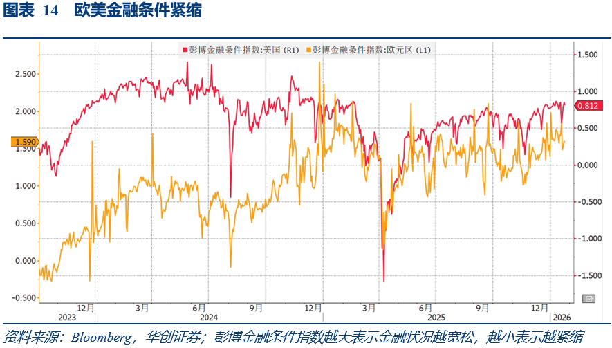 欧美国金融条件紧缩。1月23日,美国彭博金融条件指数为0.812,一周前为0.848,两周前为0.863。同期,欧元区彭博金融条件指数为1.590,一周前为1.671,两周前为1.754。