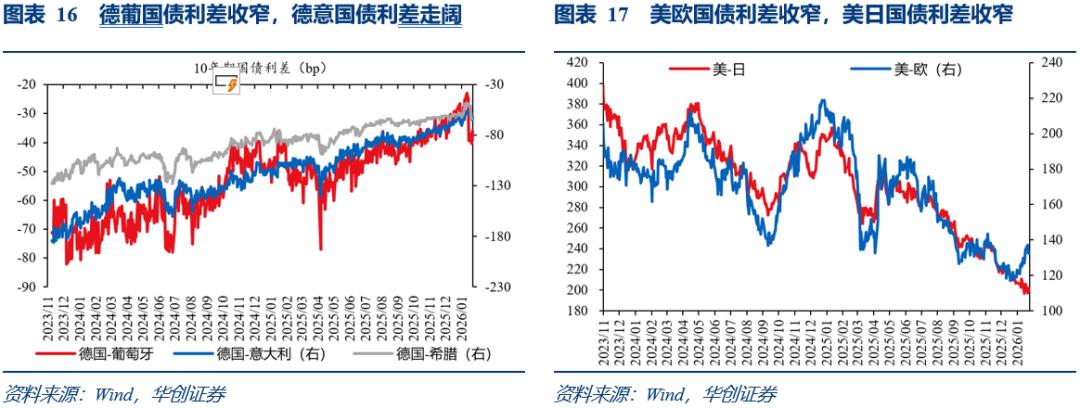 10年期德葡国债利差收窄,德意国债利差走阔。1月23日,德国与葡萄牙、意大利10年期国债利差分别为-36.0bp、-61.7bp,一周前分别为-39.0bp、-58.6bp。