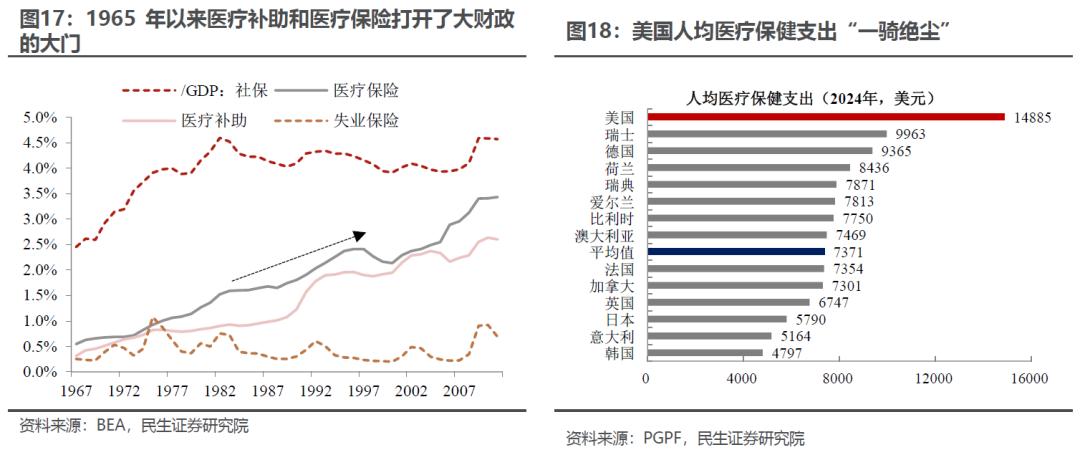 具体而言,政府补助方面,1965年林登约翰逊总统推动“伟大社会”计划落地,推动Medicare (联邦医疗保险) 和 Medicaid (医疗补助)立法,从此打开了政府大规模补贴居民的“闸门”(这也是当前特朗普想要解决的问题)。