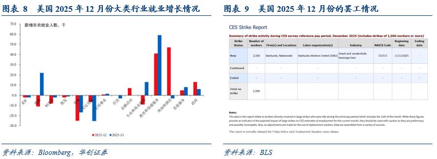 2025年12月份美国新增非农就业低于预期,且前两个月数据明显下修。新增非农就业人数5万,彭博预期7万。私人部门新增非农就业人数3.7万,彭博预期7.5万。10月新增就业从-10.5万下修至-17.3万,11月新增就业从6.4万下修至5.6万,合计下修7.6万。