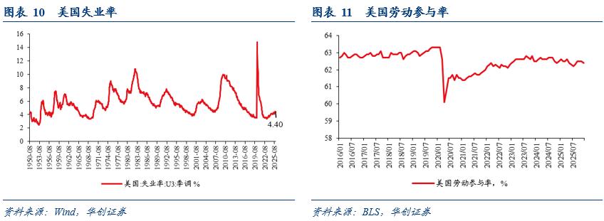 失业率录得4.4%(4.375%),预期4.5%,前值4.5%(4.536%)。劳动参与率从62.46%降至62.40%,预期62.4%。本月失业率的意外回落,主要源于就业增长和供给小幅收缩,前者影响约0.14个百分点,后者影响约0.03个百分点。