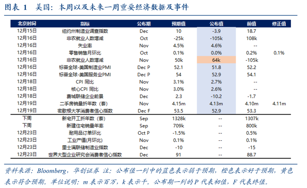 除11月新增非农就业人数好于预期之外,本周公布的经济数据均低于预期,包括10月零售销售、11月CPI数据、11月二手房销量、12月密歇根消费者信心指数、12月标普PMI初值。