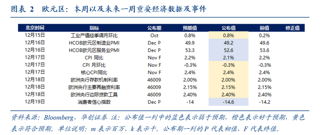 本周公布的数据中,12月议息会议结果、10月工业产值环比、11月CPI终值符合预期,12月制造业和服务业PMI初值低于预期。下周无重点数据公布。