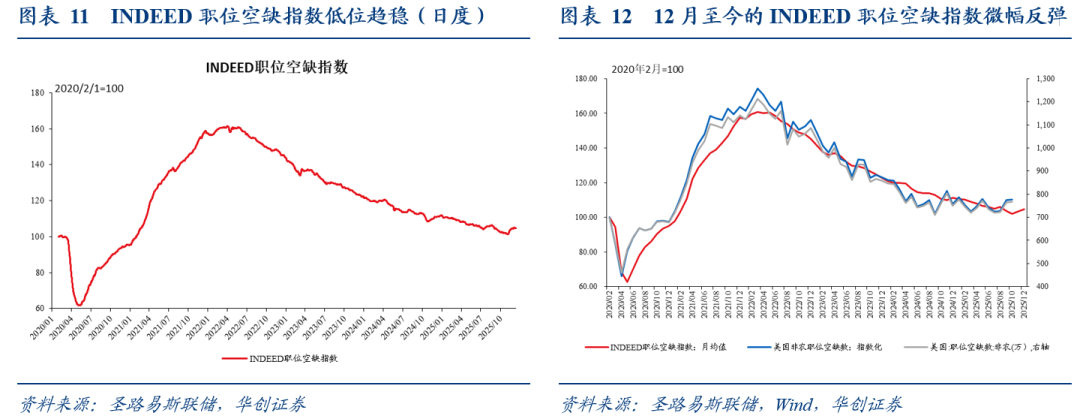 近期职位空缺数低位趋稳。截至12月12日,INDEED职位空缺指数为104.66,较前一周五环比-0.2%。12月至今的INDEED职位空缺指数均值为104.76,高于11月均值的103.22。