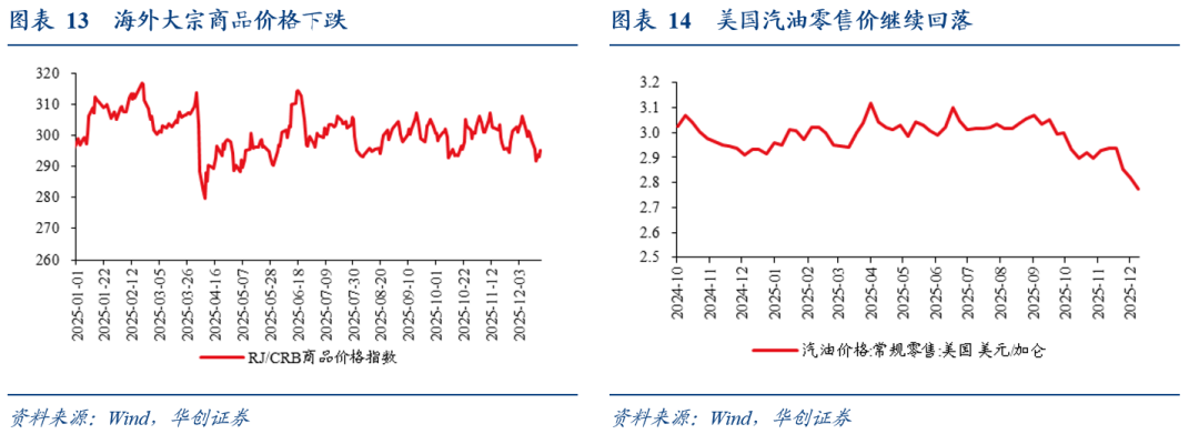 海外大宗商品价格下跌。12月19日,RJ/CRB商品价格指数周环比-1.1%,前一周环比-2.5%。