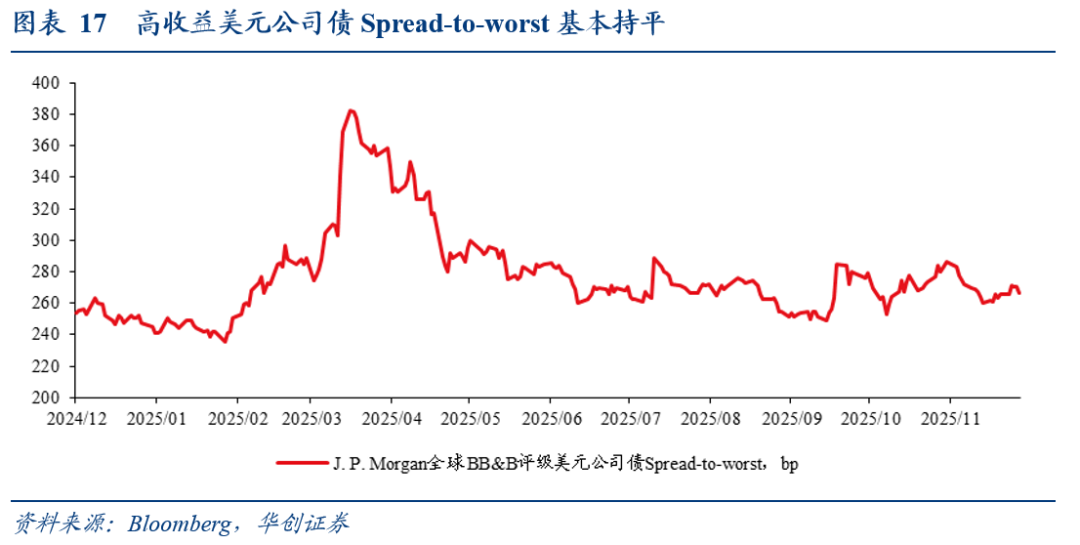 高收益美元公司债Spread-to-worst利差基本持平。12月19日,J. P. Morgan全球BB&B评级的美元公司债的Spread-to-worst为266.118bp,较上周五小幅扩大0.109bp。