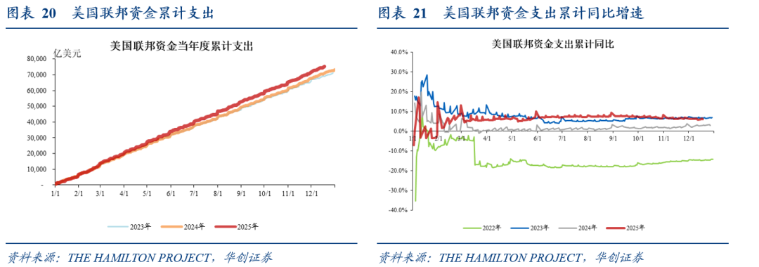 利用美国财政部《每日财政报表》(Daily Treasury Statements)中日度的联邦资金支出规模来高频跟踪美国财政支出变化。截至12月18日,今年美国联邦资金累计支出约7.537万亿美元,同比增速6%;去年同期的同比增速为3%。